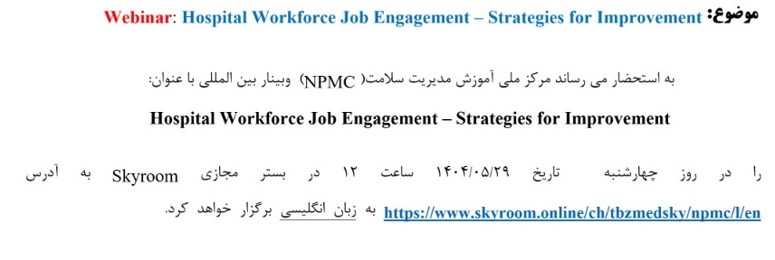 وبینار آموزشی بین المللی Hospital Workforce Job Engagement – Strategies for Improvement ۲۹ مرداد ۱۴۰۴ | ۱۰:۰۱ کد : ۵۳۹۲۵ اطلاعیه ارسال به دیگران نام شما ایمیل شما ایمیل دریافتکننده ارسال انصراف تعداد بازدید:۱۸۶۸ وبینار آموزشی بین المللی Hospital Workforce Job Engagement – Strategies for Improvement