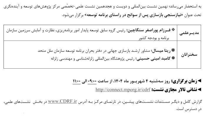 نشست علمی نیاز سنجی بازسازی سوانح در راستای برنامه توسعه ۰۳ شهریور ۱۴۰۴ | ۱۲:۳۷ کد : ۵۴۰۰۰ اطلاعیه ارسال به دیگران نام شما ایمیل شما ایمیل دریافتکننده ارسال انصراف تعداد بازدید:۱۶۷۴ نشست علمی نیاز سنجی بازسازی سوانح در راستای برنامه توسعه، توسط مرکز پژوهش های توسعه و آینده نگری برگزار می گردد.