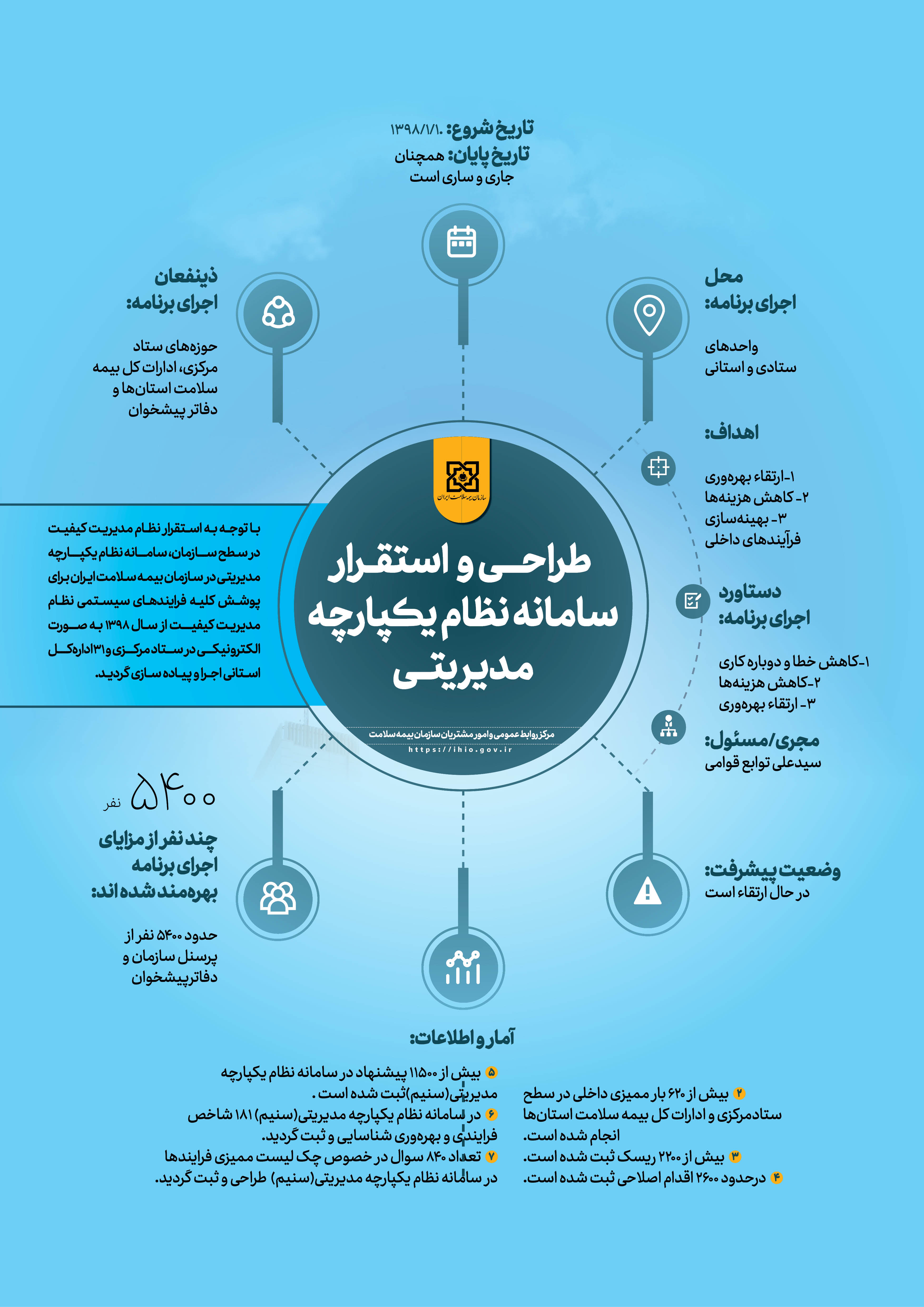 باتوجه به آغاز هفته بیمه سلامت، با شعار محوری وفاق ملی برای ایرانی سالم تر، پوسترهای خدمات قابل ارائه و دستاوردهای31 ساله سازمان بیمه سلامت ایران، جهت اطالع رسانی به پیوست می باشد.