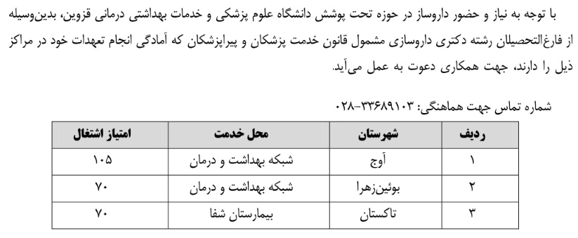 جذب نیروی داروساز مشمول قانون خدمت ۲۵ آذر ۱۴۰۴ | ۰۹:۰۰ کد : ۵۷۰۵۷ اطلاعیه ارسال به دیگران نام شما ایمیل شما ایمیل دریافتکننده ارسال انصراف تعداد بازدید:۶۳۷ جذب نیروی داروساز مشمول قانون خدمت در دانشگاه علوم پزشکی قزوین